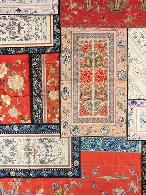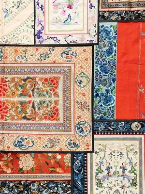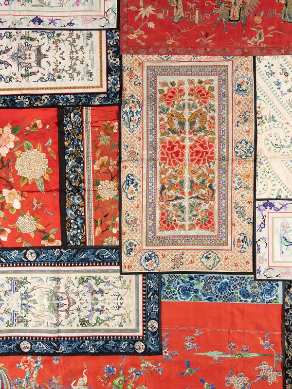 each of rectangular form and embroidered with floral designs and auspicious emblems.