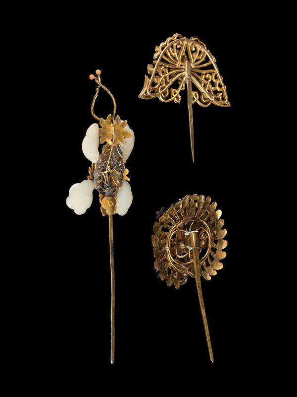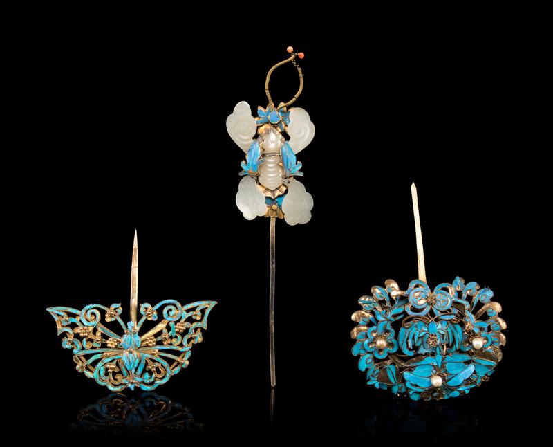 清晚期 銀鎏金點翠簪一組三件