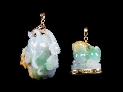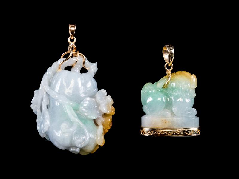 Two 14K Yellow Gold Mounted Apple Green, Russet and White Jadeite Pendants
