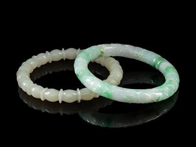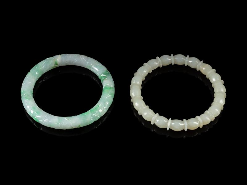 清晚期 青白玉蓮子式鐲及翠雕花卉紋圓鐲各一