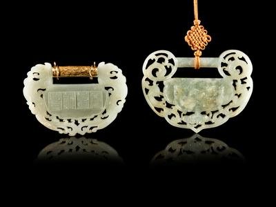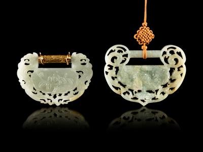 each carved in low relief with flowering peony branches and Yutang fugui motifs, the stone of very pale celadon tone.