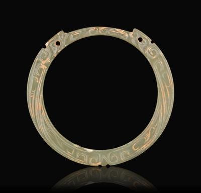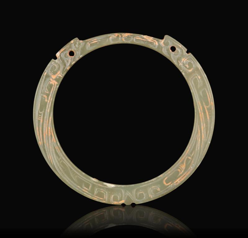 of circular form, pierced with twp apertures, the stone of a variegated celadon and russet tone.