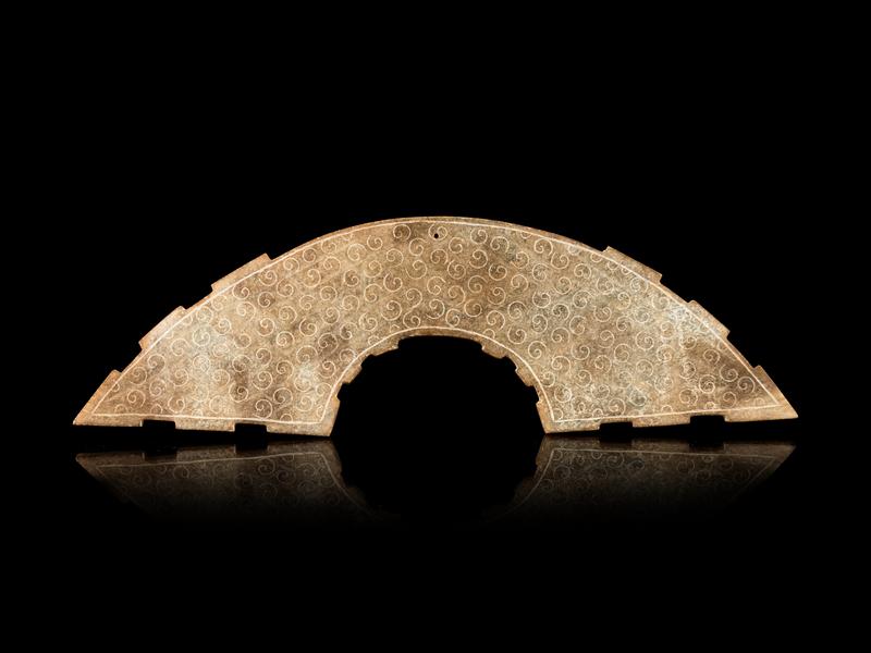 of thin arc shape, carved in low relief with small detached scrolls, the edges with rectangular notches, the stone of grey color with dark brown inclusions.