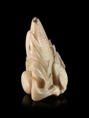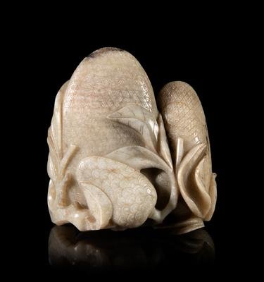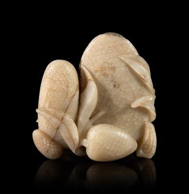 carved as a flatted lichi fruit with leafy vines, the stone of creamy beige tone.