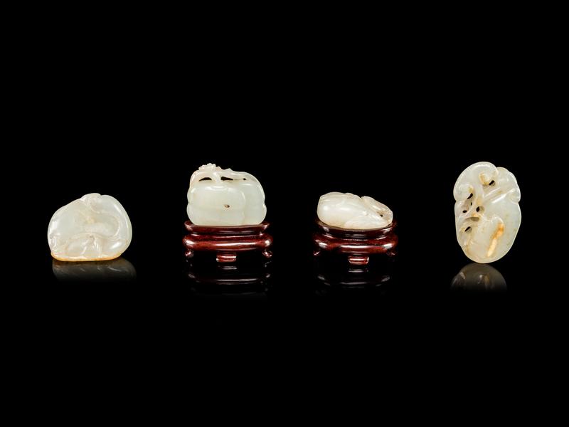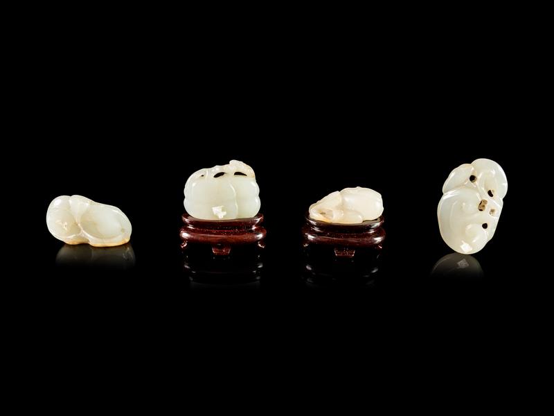 comprising a fruit example, a double-gourd example, and a lingzhi sprig example, each stone of creamy with color with natural russet inclusions.