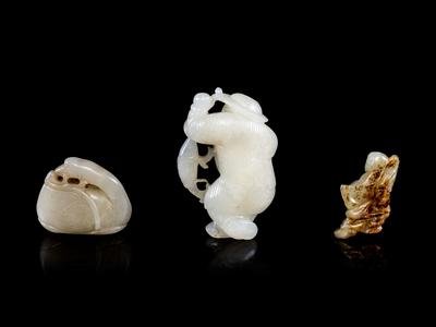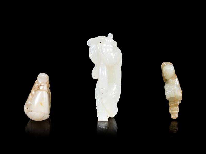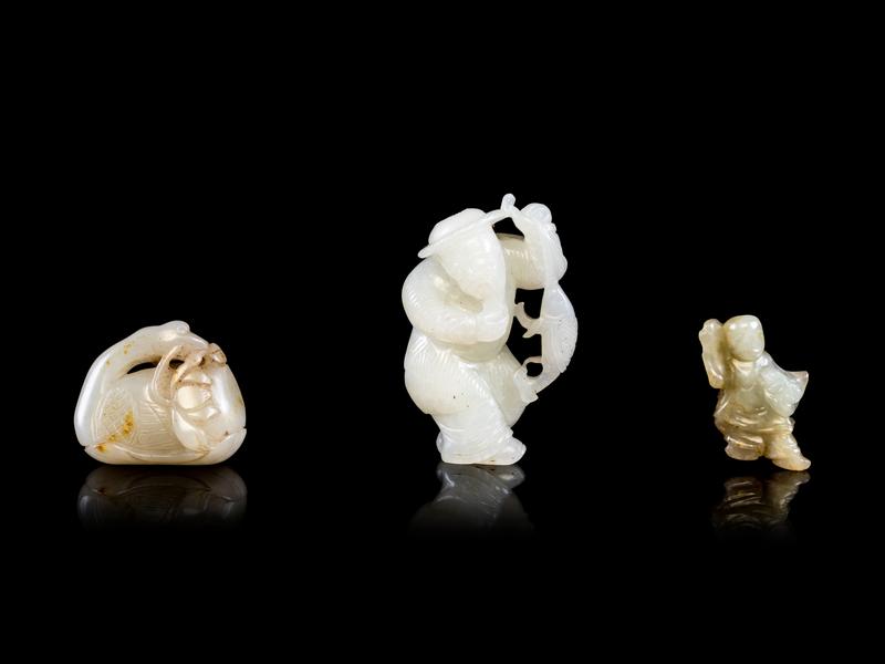the first a white jade figure of a fisherman, the second a small celadon jade figure of a boy and the third a small pale celadon jade figure of a duck bearing a large lotus sprig in its beak.
