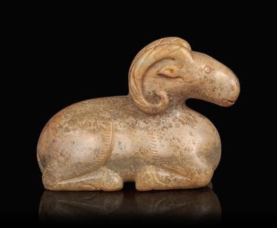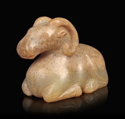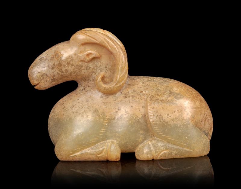 carved with its hoofed legs tucked under its body, the stone of a mottled beige color.