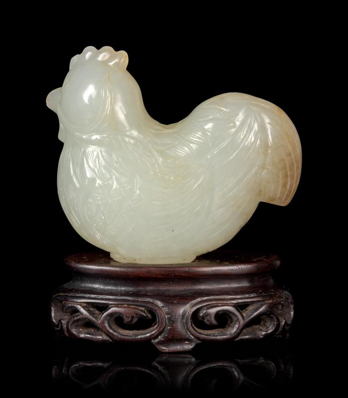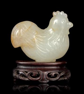 A Carved Pale Celadon and Russet Jade Figure of Rooster