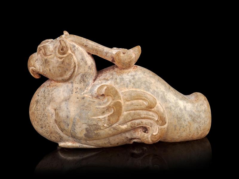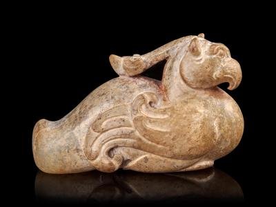 carved with broad wings, its claws neatly tucked beneath its body, the smoothly polished stone picked out with patches of russet and yellow inclusions.