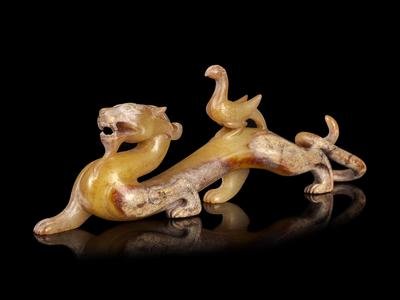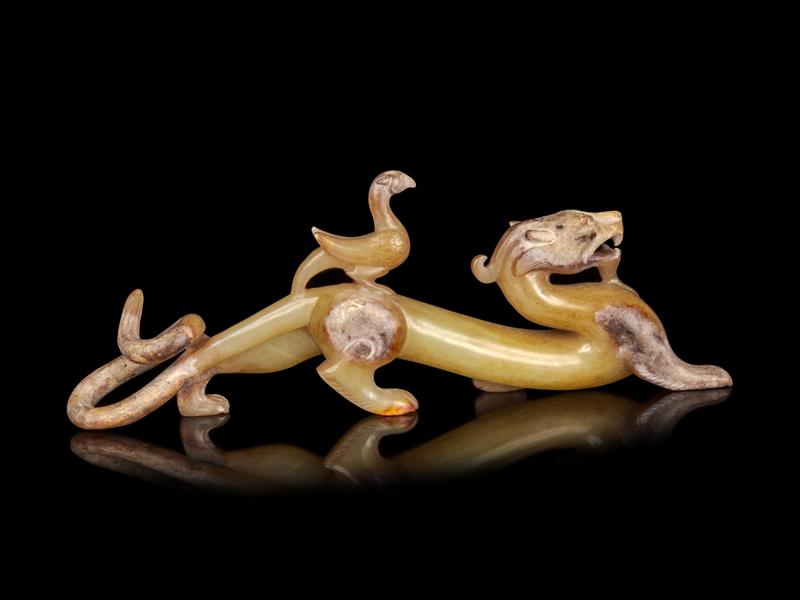 carved as a sinuous dragon, the long body forming an S-curve, carried a bird over its back, the stone of a beige-yellow color with brown speckles.