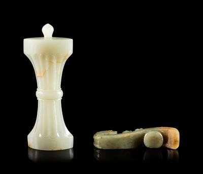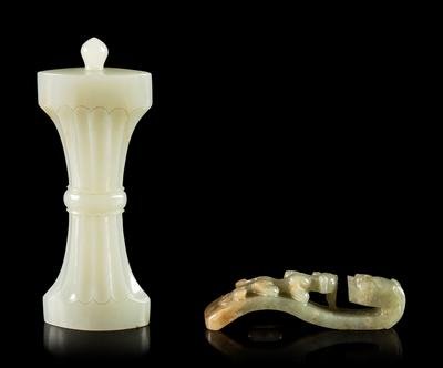 the first a pale celadon jade pendant in the form of a miniature gu vase, the second a green and russet jade dragon-head belt hook.