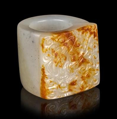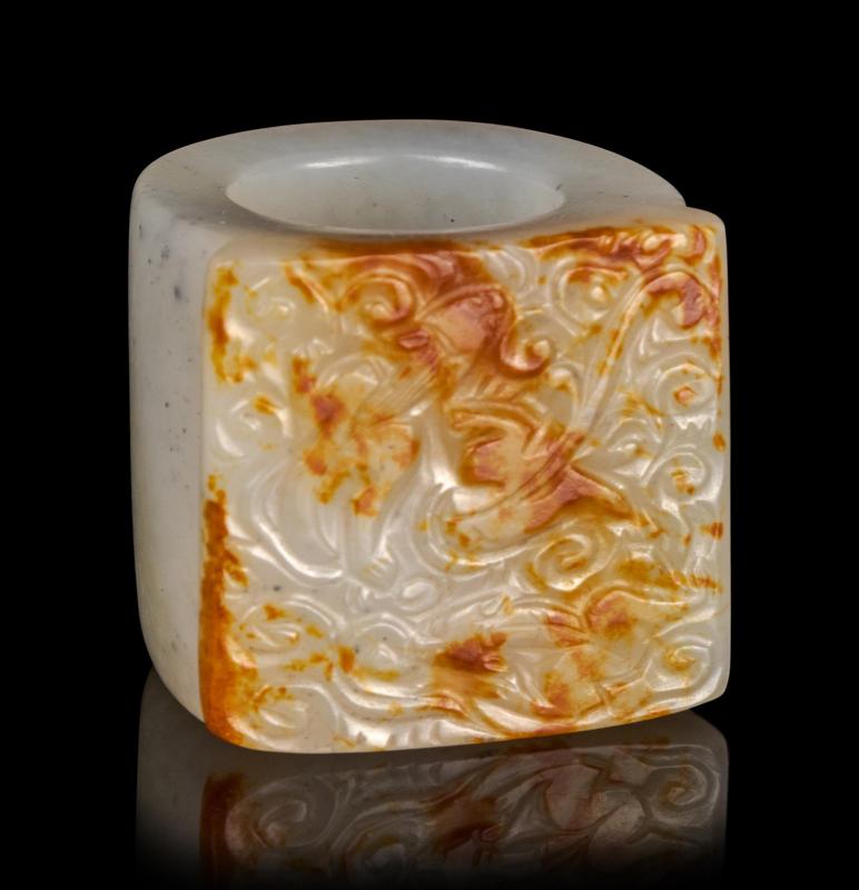 one side carved in low relief with chilongs and clouds, the stone of white tone with russet inclusions.