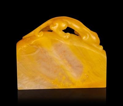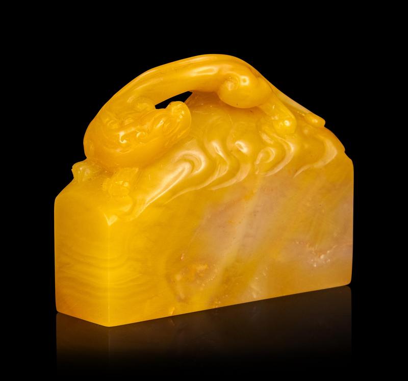 of square section carved with a finial in the form of a recumbent Chilong glancing over its left shoulder.