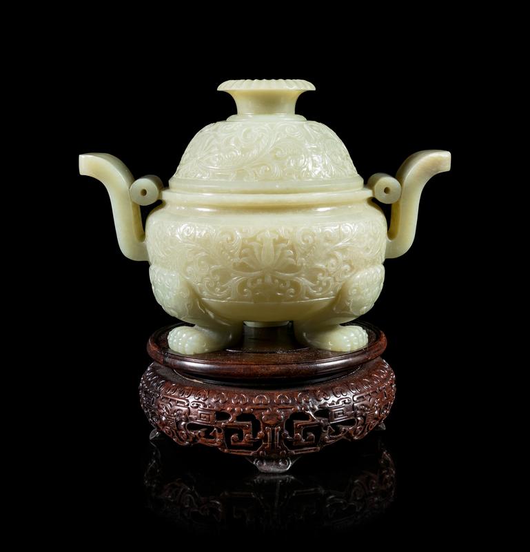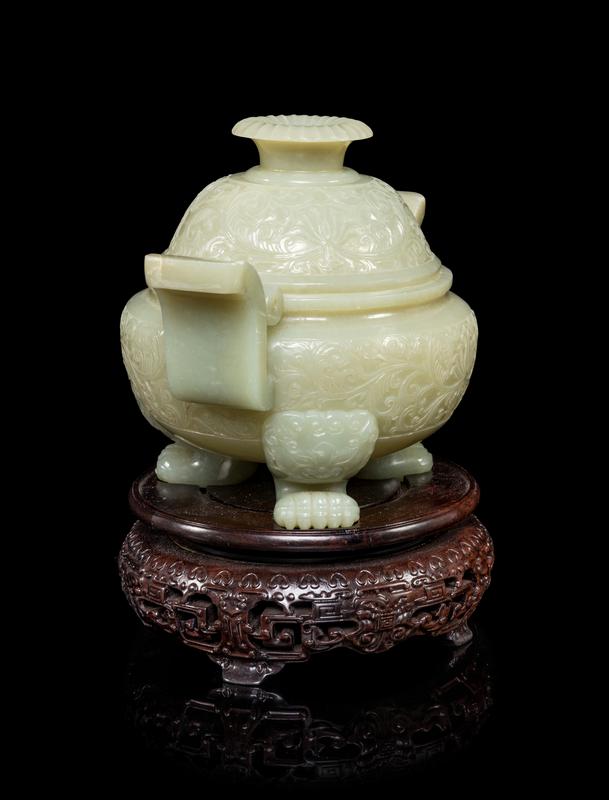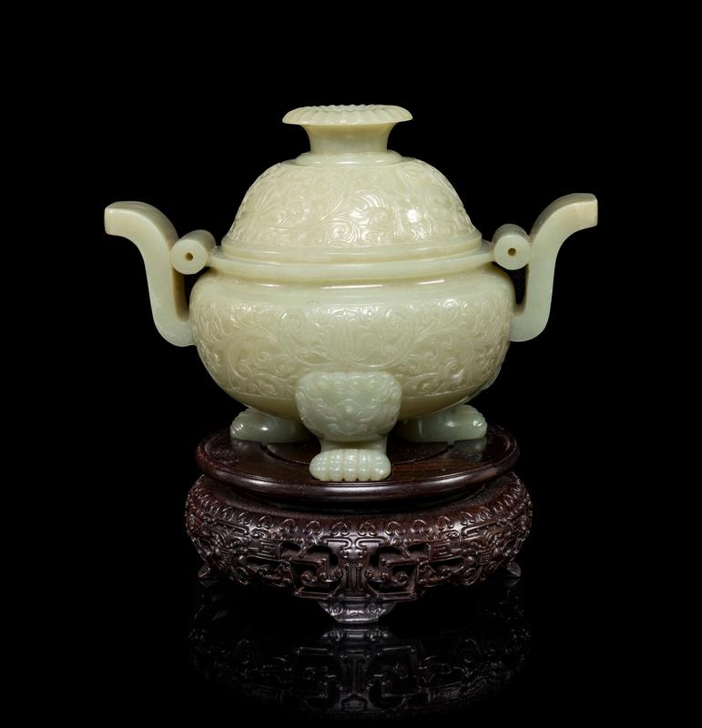of compressed globular form raised on three cabriole legs issuing from lion masks, flanked by a pair of upright curved handles, each side carved with lotus scrolls, the smoothly polished stone of pale celadon color, with fitted wood stand.