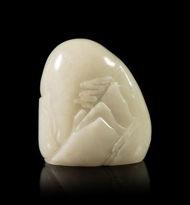 well carved with a couple in a mountainous scene under pine trees, the stone an even celadon tone with white inclusions.
