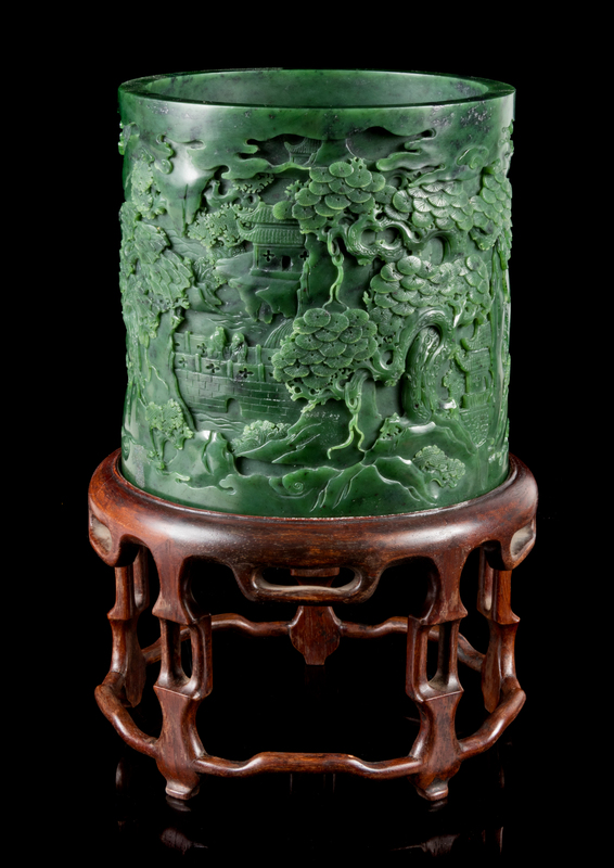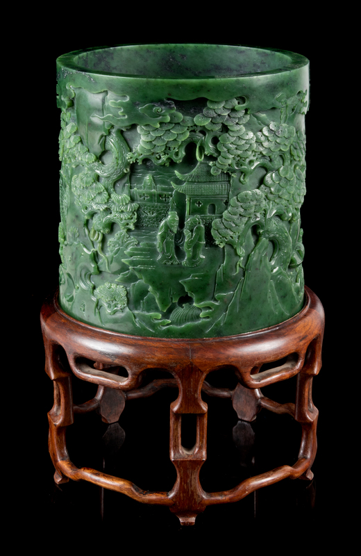 having thick cylindrical sides, the exterior carved to show a continuous mountain scene depicting two scholars having a conversation outside pavilions underneath pine trees, two others crossing a bridge amongst rockworks and further pine trees, raised on a fitted rosewood stand.
