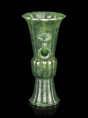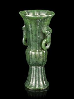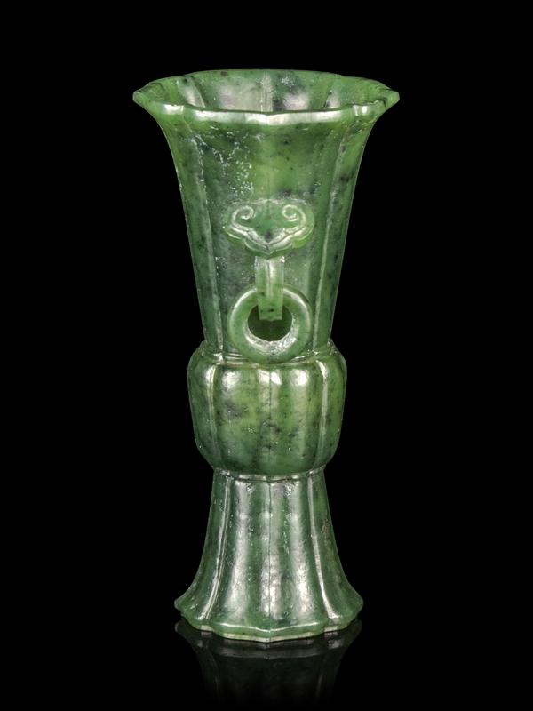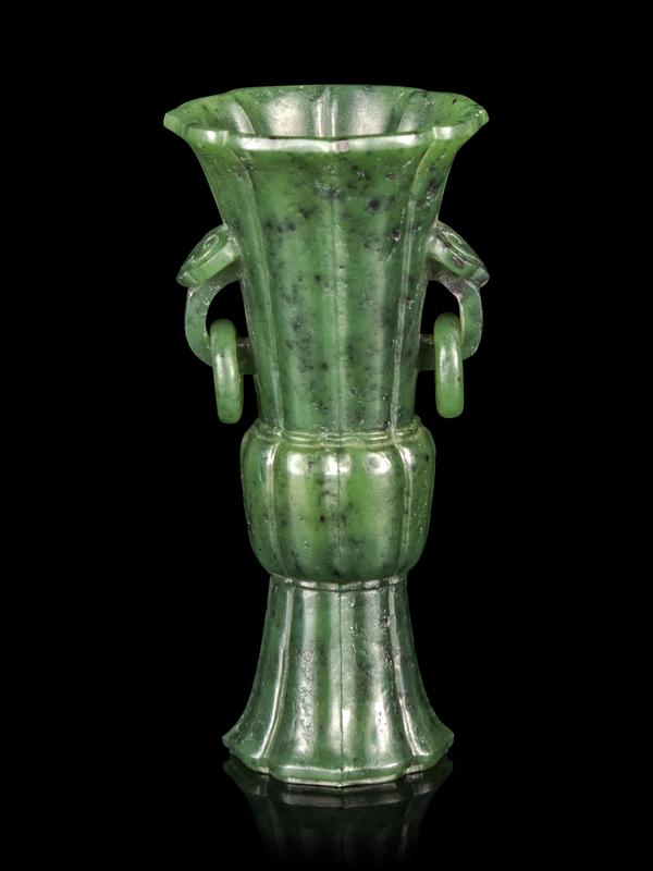 with lobed body section and flared mouth above two mask-handles, the stone of a spinach green color with light and dark inclusions.
