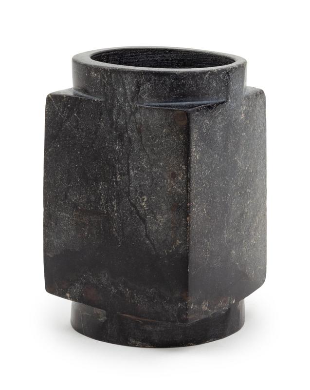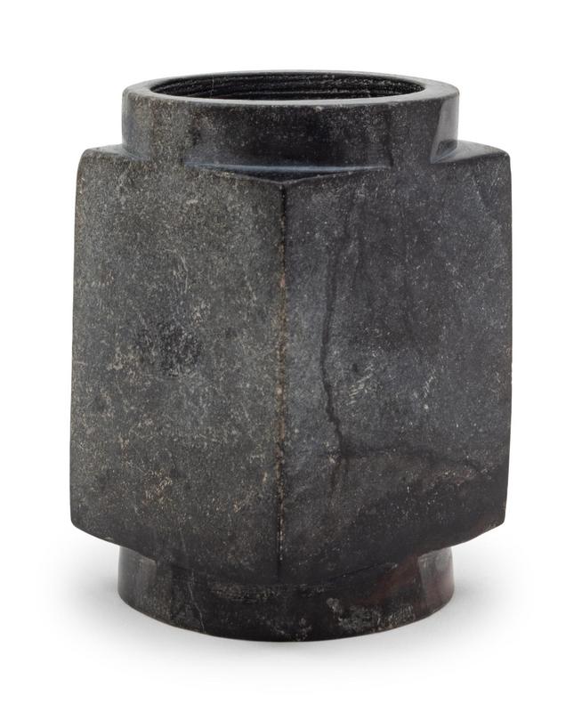 of square section with short neck and foot, stone of brownish-black color with grey inclusions.
