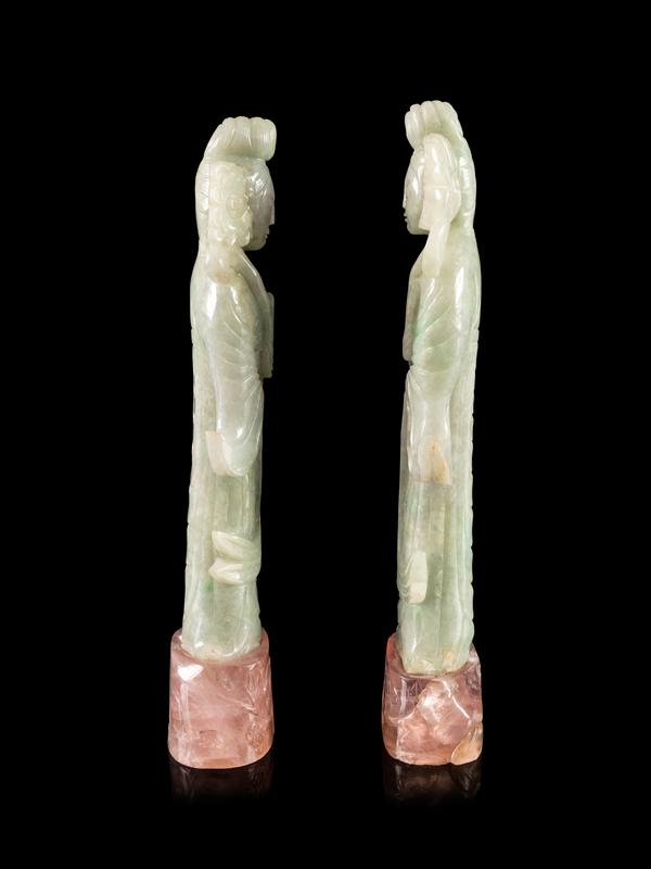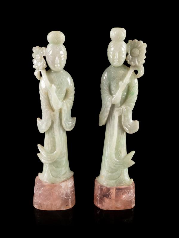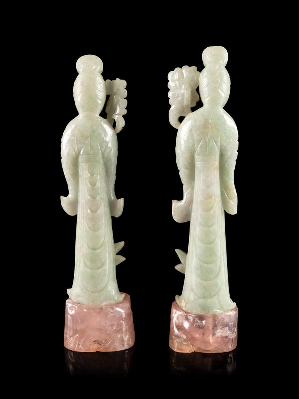 A Pair of Pale Celadon Jadeite Figures of Female Immortals