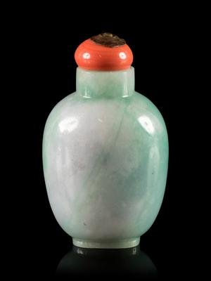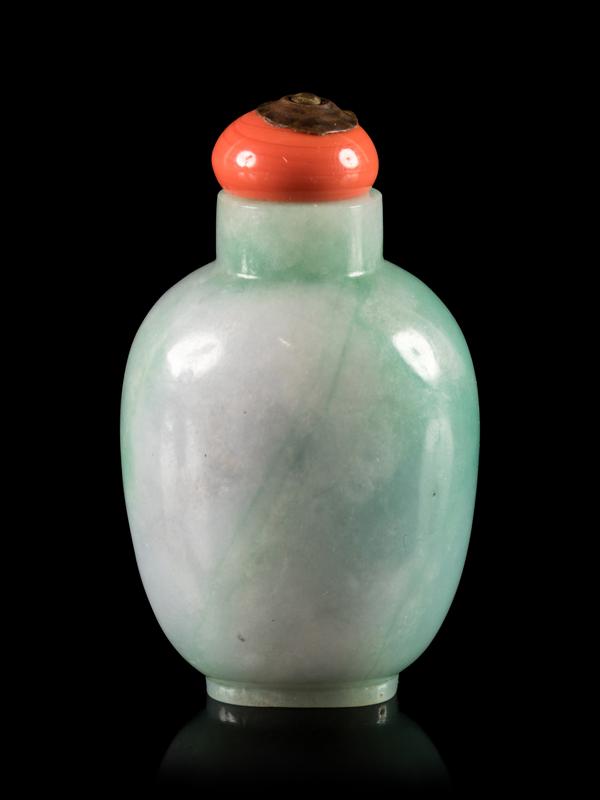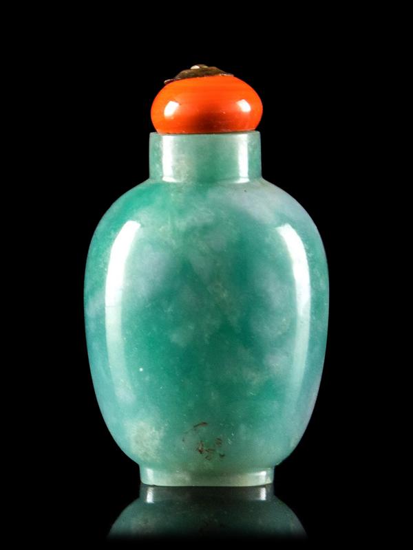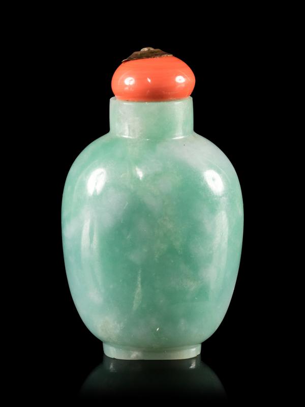 of ovoid form atop a flat oval base and below a gently flared neck, the stone of rich emerald tone with natural celadon inclusions, coral stopper.