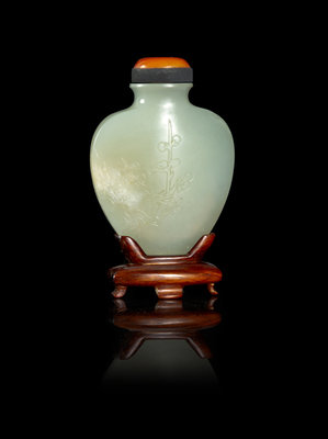 of compressed rounded form with broad shoulders tapering to a flat narrow base, incised to one side with cherry-blossoms, raised from a fitted wood stand, with silver mounted coral stopper.