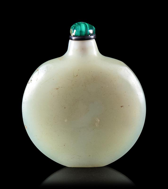 carved as a compressed and flat ovoid body, the stone of a milky white tone with russet patches.