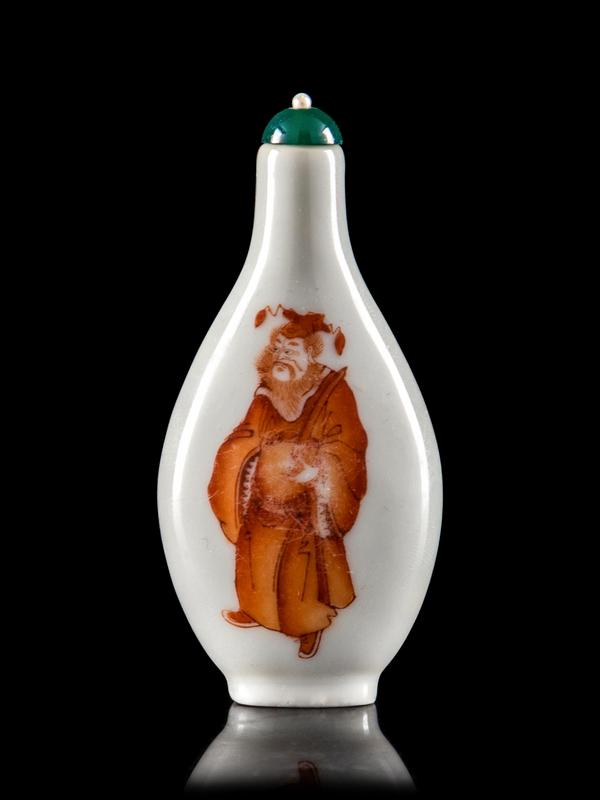 with a pear shape body and flat circular foot, painted on both sides with Zhong Kui, the green hardstone stopper inset with a tiny pearl.