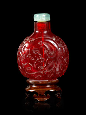 清中期 寶石紅料雕螭龍紋鼻煙壺