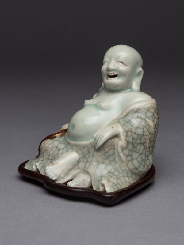 the laughing deity modeled seated, wearing a loose robe, with his left hand rest on the knee and right hand grasping a sack,