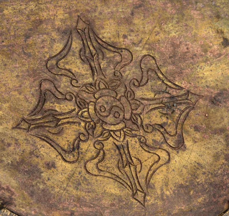 cast seated in dhyanasana upon a double lotus pedestal base with his hands supporting his consort, wearing a dhoti with diaper border and an elaborate jeweled necklace, his face framed by a high five-pointed crown.