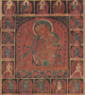 depicted the bodhisattva seated at center wearing elegant jewelry, flanked by eighteen other Maitreyas, Taras and Vajrapanis.