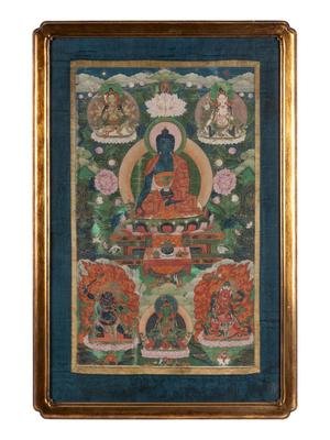 the blue Medicine Buddha seated in vajraparyankasana and holding a myrobolan in the right hand with left in dhyana mudra holding a patra, mounted with blue silk, framed.