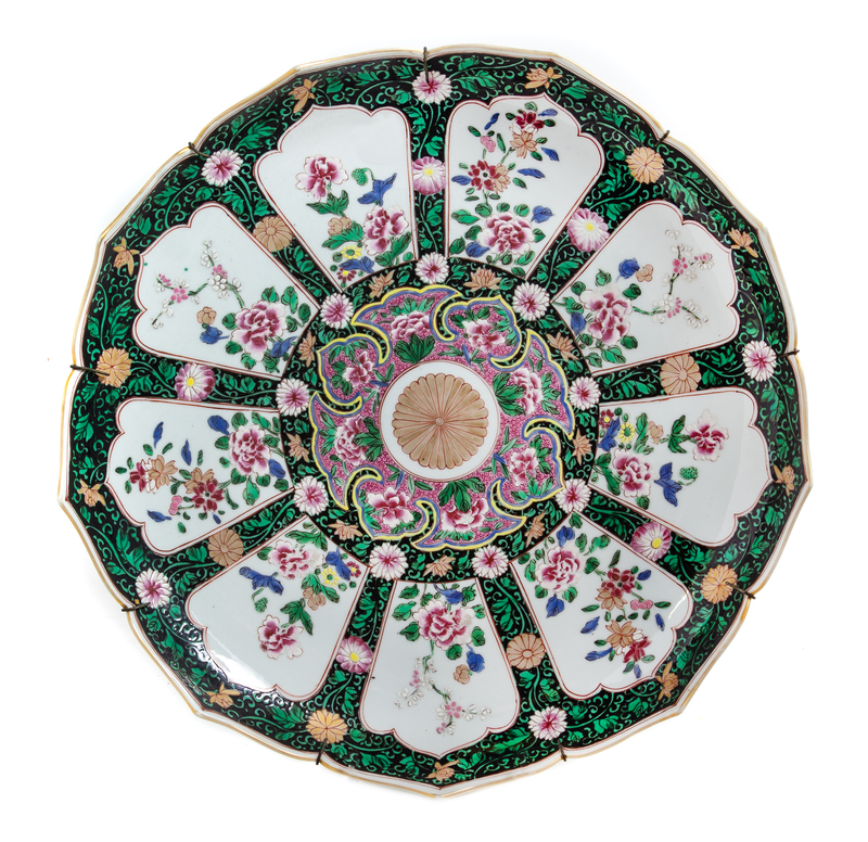 having a scalloped rim and nine shaped panels, each enclosing floral decoration in various colored enamels.