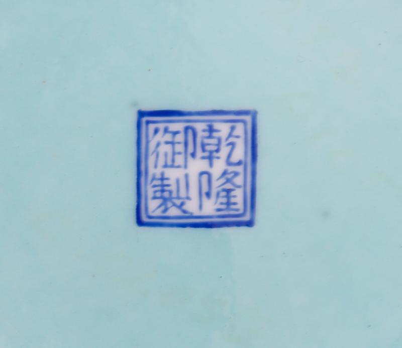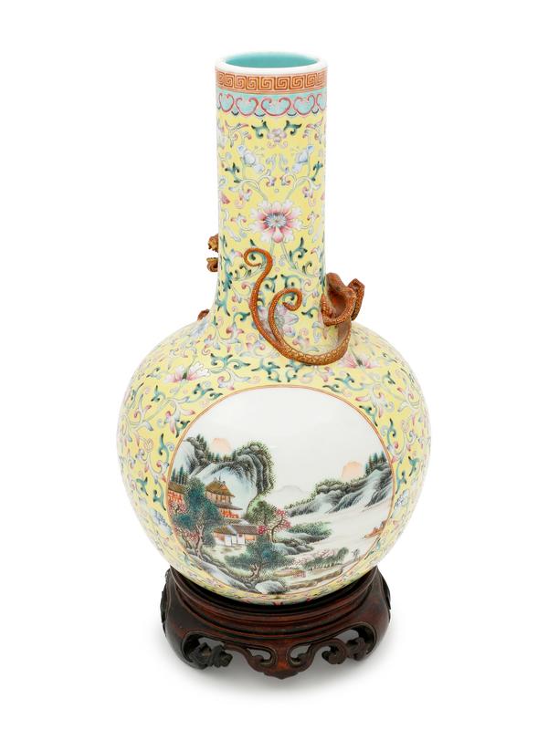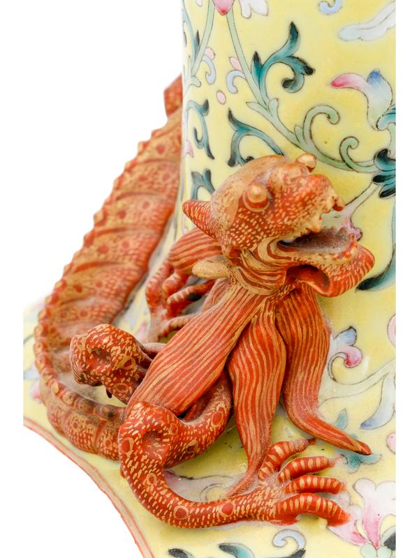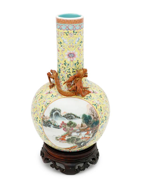 the compressed globular body rising from a short foot to a long slender neck, coiled around the base of the neck with an iron-red and gilt chilong , all reserved against a yellow ground and decorated in floral scrolls.