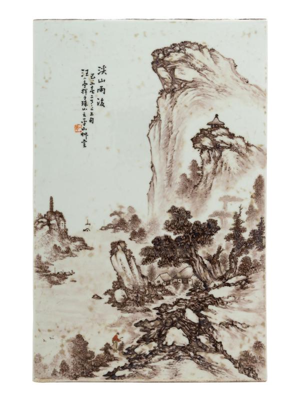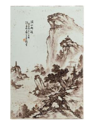 the rectangular plaque enameled with a mountainous landscape by the river, detailed with pavilions and figures.