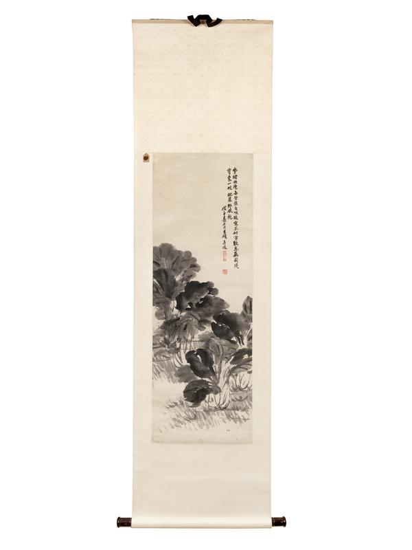款識:花豬肉瘦每登盤,自咲酸寒不耐餐。歎息蕪園殘雪裏,一畦肥菜野風幹。