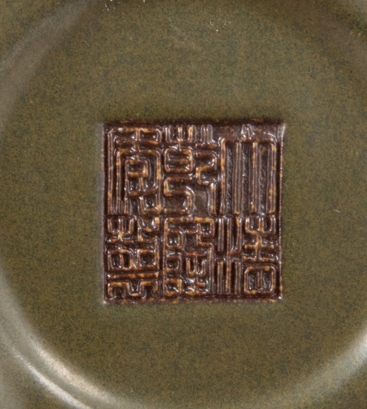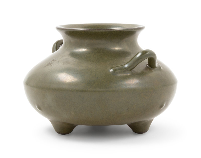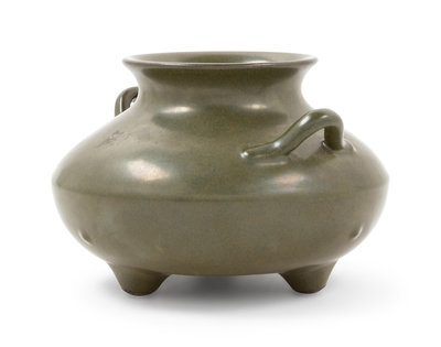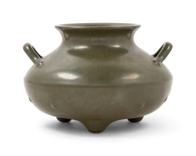 the oval-shaped body resting on a slightly flared foot, the shoulder flanked by two looped handles.