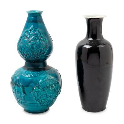 comprising one turquoise gourd form example with carved and molded decoration, and one mirror black example.