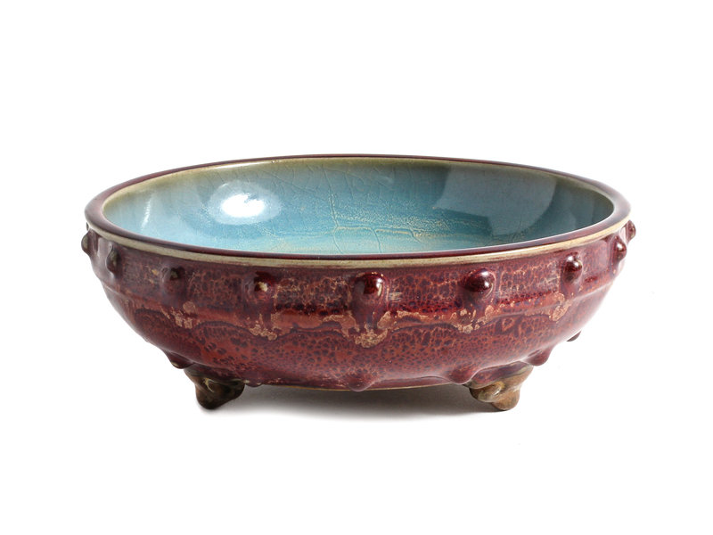 the compressed squat body raised above tripod feet, decorated to the exterior with raised bosses and covered in a dense glaze.