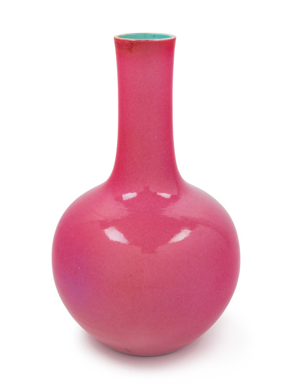 the globular body rising from a countersunk base to a tall tubular neck, covered with a rich pink glaze.