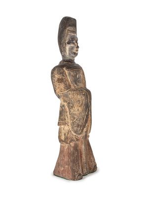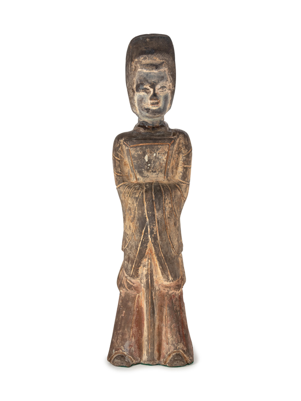 depicting an attendant with clasped hands and draped robes, with traces of pigment.
