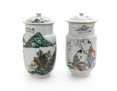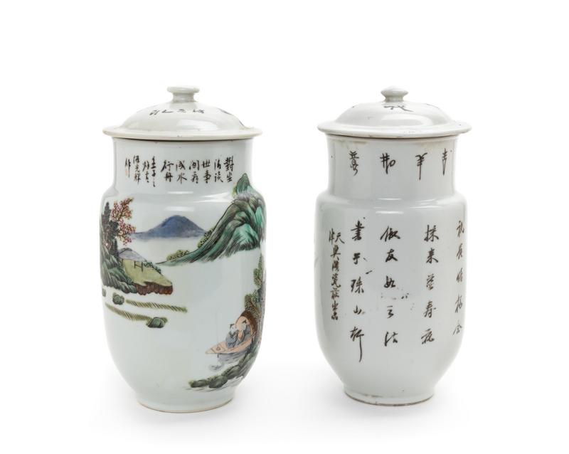 each with high sides rising from a straight foot, narrowing to a slightly tapered neck, and surmounted by a conforming cover; one example painted with ladies in a forested scene, the other with figures riding through a landscape in a fishing boat.