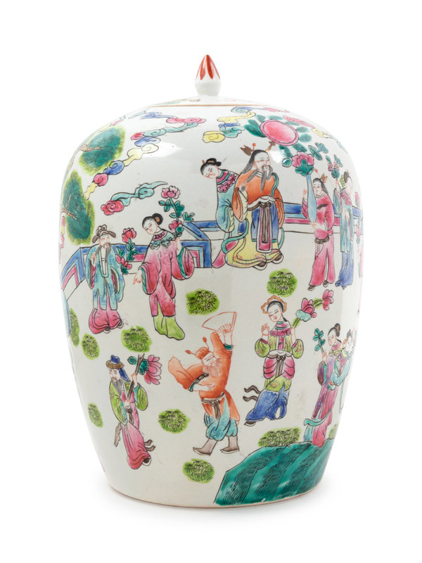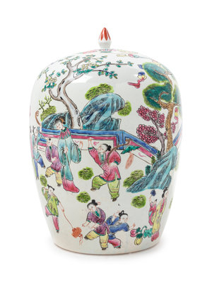 painted with a continuous scene of young men, ladies and and children play in a garden.