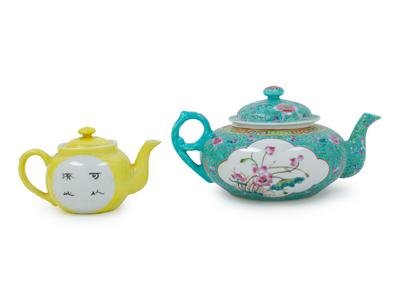 each of compressed globular form, decorated with shaped panel enclosing flowers and inscriptions.