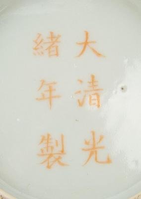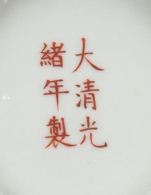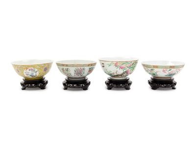 each with sloping sides rising from a straight foot, further raised upon a fitted hardwood stand; the first painted to the exterior with a scene of cranes perched among rockery and peach trees between gilt bands at the foot and mouth rim, the interior with an incised and painted nested crane, and the underside with a six-character Guangxu mark in underglaze blue; the second decorated with four medallions of one hundred antiquities reserved on a yellow ground of floral scrolls, the underside incised with a six-character iron-red Guangxu mark; the third a shallow bowl decorated with auspicious emblems between repeating borders, the underside incised with six-character iron-red Guangxu mark; the last a shallow wide-mouthed example with flowers between decorative borders, and the underside incised with a six-character Guangxu mark in underglaze blue.