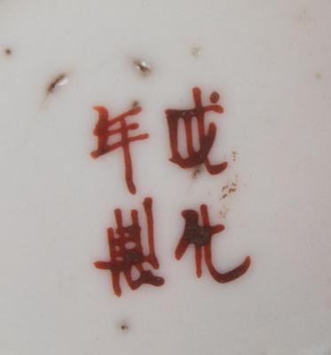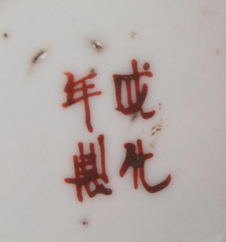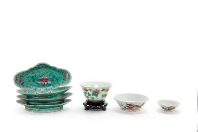 comprising one bowl of quatrefoil form with sloping walls painted with floral decoration rising from a short straight foot, the underside incised with an apocryphal Chenghua four-character mark, and raised upon a hardwood stand, one shallow dish rising from a straight short foot, painted to the exterior with fruiting branches, one densely potted shallow bowl decorated with a chasing dragon, and four green ground peony decorated offering dishes.