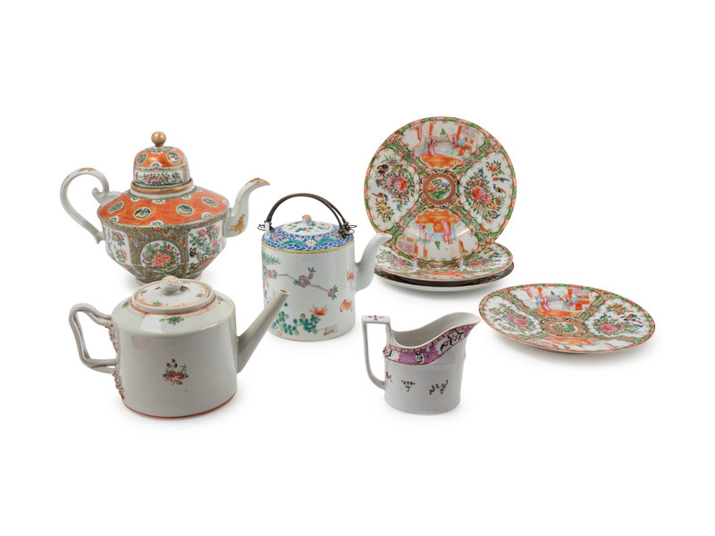 comprising two Chinese famille rose porcelain teapots, a Chinese export famille rose porcelain creamer, four Chinese export rose medallion plates, and a Japanese teapot.
