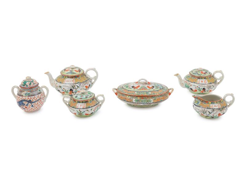 comprising two teapots, two covered sugars, one creamer, and one oval-shaped covered dish.