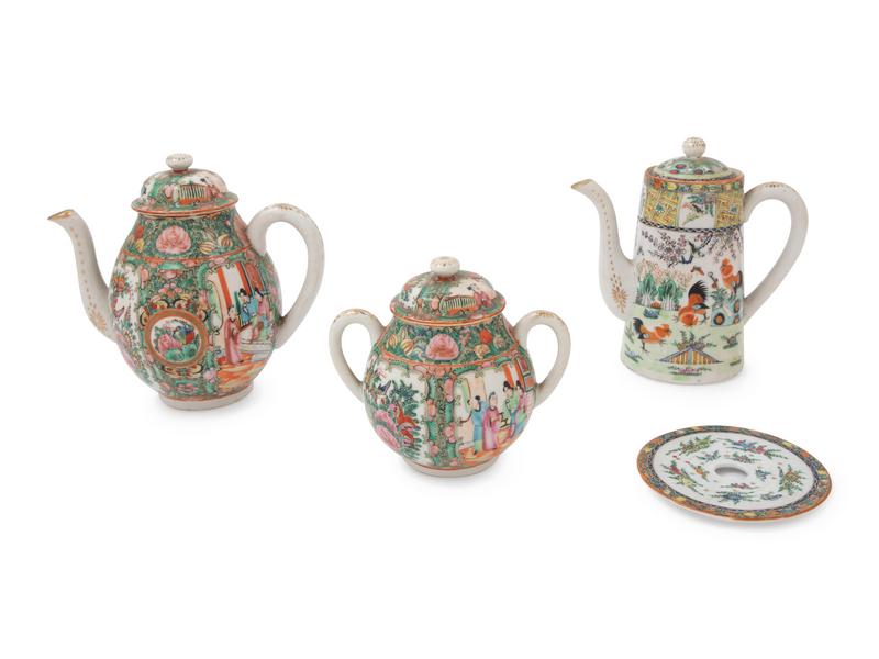 comprising three covered teapots and one reticulated circular dish.