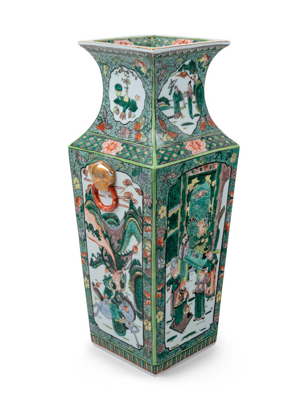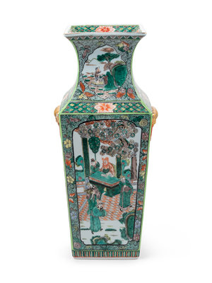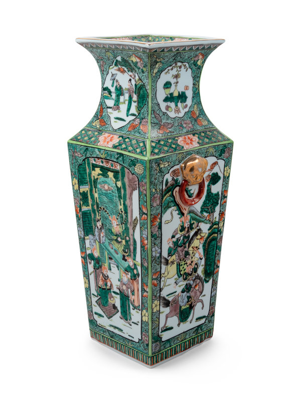 each squared section decorated with shaped panels, enclosing figures in a court and warriors on horseback.